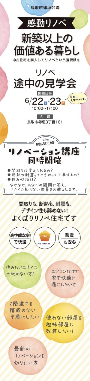今回、鳥取市立川町と鳥取市卯垣で見学会(内覧会・オープンハウス)を開催です。