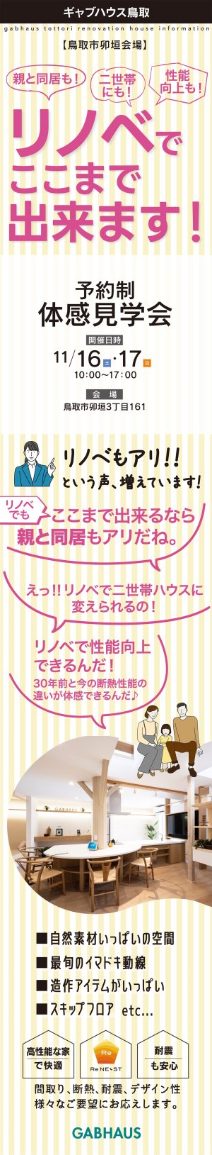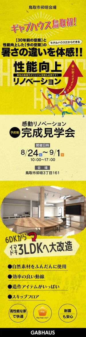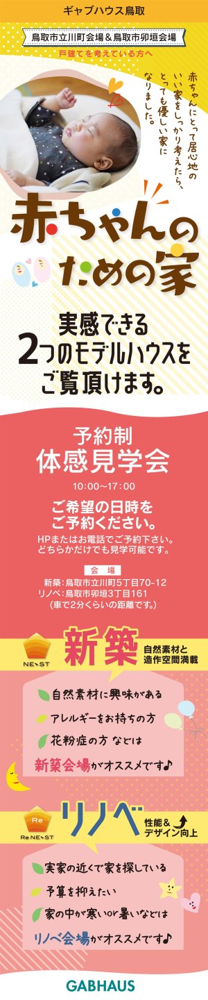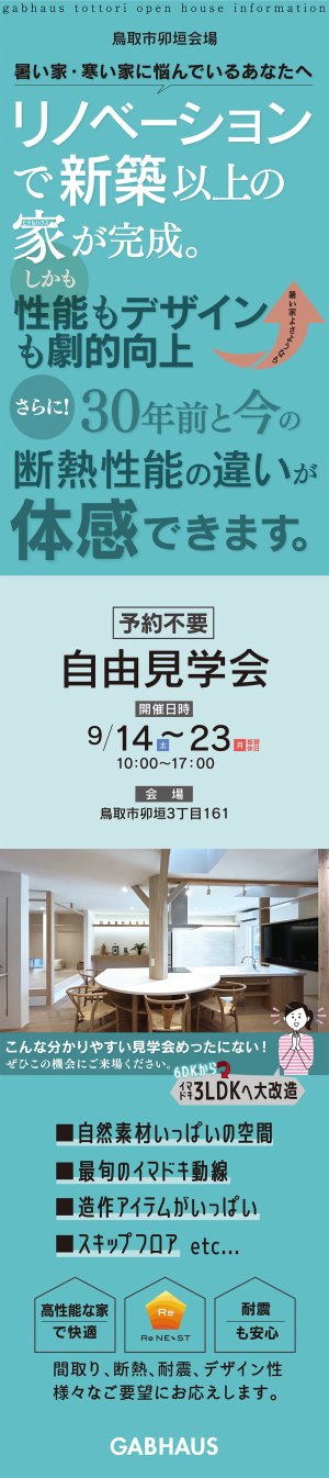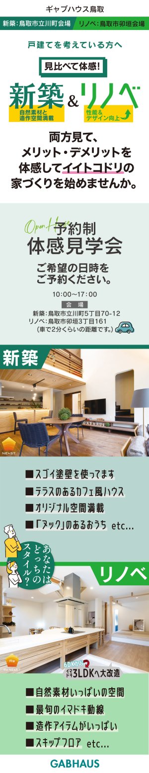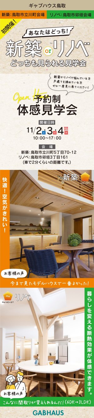 ギャブハウス鳥取は、鳥取、鳥取市、岩美郡岩美町、八頭郡、兵庫、美方郡新温泉町で新築とリベノーションの家づくりをしています。